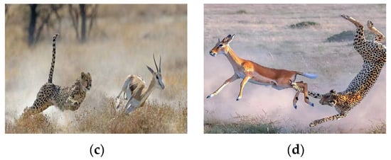 Cheetah hunting behavior. (a) searching; (b) sitting and waiting; (c) capture; (d) full-speed impact.