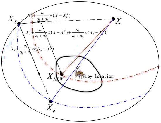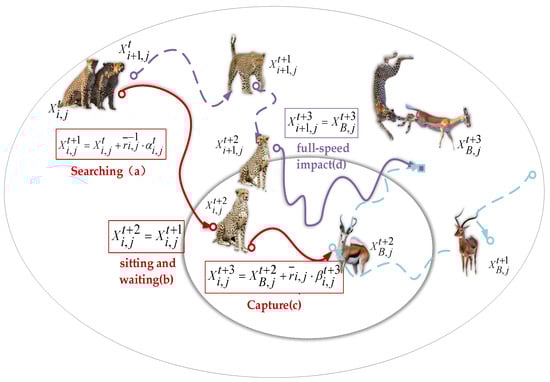 The schematic diagram of the algorithm selection mechanism is shown in Figure 2. The red, purple, and blue lines represent the movements of cheetahs, neighboring cheetahs, and prey, respectively, during a complete hunting operation. In each permutation of the algorithm, each cheetah represents a separate hunting mode from the other. The energy of the cheetah is independent of the prey and related to time. The CO algorithm controls the energy by setting the hunting period and representing each decision variable as the alignment of a cheetah during the optimization process [], which prevents the optimization from converging prematurely and improves the global search capability.