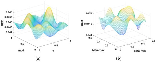 The system BER as affected by initialization parameters. (a) mod and T-parameter simulation; (b) Scaling factor parameter simulation.