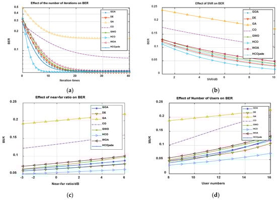 From Figure 5d, we observe that although the BER of the HCO algorithm grows from 0.039 to 0.042 as the system’s user count increases, the evolution of the BER of the HCO algorithm grows more gently with an increase in the number of users than the other algorithms. The BER is kept at the lowest level, indicating that the HCO algorithm is minimally affected by growth in the number of users and has the largest communication capacity.
