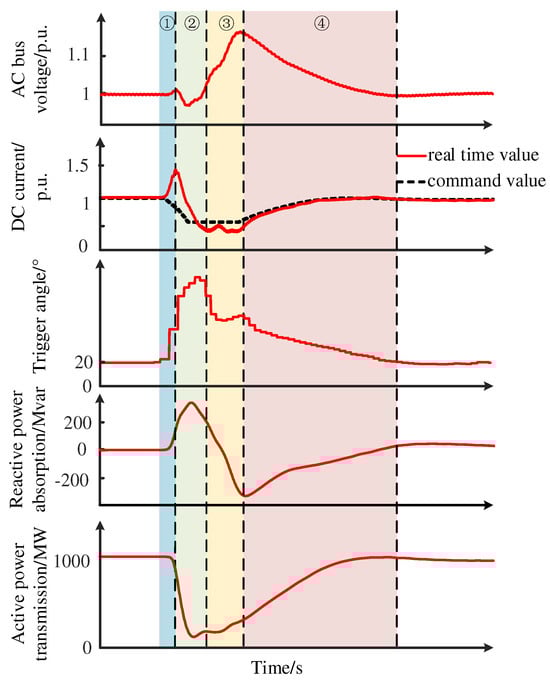 A commutation failure occurs when a valve expected to turn off fails to regain the blocking ability under reverse voltage or cannot complete the turn-off process, which causes an inverse commutating phase from the valve expected to turn off to the valve expected to turn on. The DC current changes under the combined action of the control of the inverter and rectifier stations, which results in fluctuations in active power and reactive power consumption at the rectifier station. The power fluctuations change the AC bus voltage of the rectifier station, as shown in Figure 2. The transient of LCC-HVDC after commutation failure can be divided into four stages.