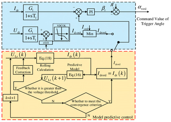The trigger angle is related to the DC current, so the dynamic model of the AC bus voltage reflects the relationship between the AC bus voltage and the DC current, which depicts the feasible range of the AC bus voltage of the rectifier station under the coupling effect of the sending-end grid and the rectifier station. The feasible range is related to the DC current. The AC transient overvoltage can be suppressed by controlling the DC current. According to the dynamic model, the improved suppression method of AC transient overvoltage is proposed based on the model of predictive control, as shown in Figure 5.
