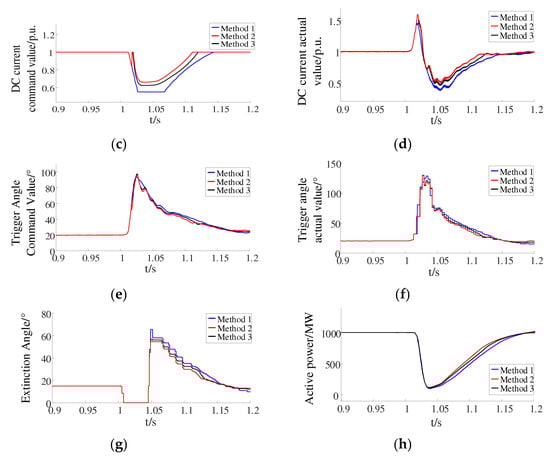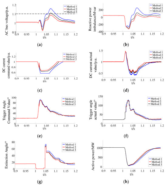 The DC current under Method 2 was greater than that of Method 1 and Method 3, which reduced the reactive power imbalance, as shown in Figure 9b–d. As shown in Figure 9e,f, the command and actual values of the trigger angle under Method 2 were smaller than those of Method 1 and Method 3. Meanwhile, the variation in the active power fed to the rectifier station under Method 2 was also smaller than that of Method 1 and Method 3, as shown in Figure 9h. There were no subsequent commutation failures under the three methods. The effectiveness of Method 2 was fully verified.