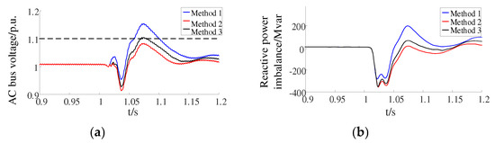 When a three-phase fault occurred, as shown in Figure 6a, the maximum value of the AC bus voltage under Method 1 was 1.159 p.u., which was more than the allowable voltage threshold. The AC bus voltage was decreased by compensating for the reactive power consumption under Method 3. However, the maximum voltage was 1.109 p.u., which still exceeded the allowable voltage threshold due to neglecting the effects of active power and AC-DC system coupling. The maximum AC bus voltage under Method 2 was 1.087 p.u., which was less than the allowable voltage threshold of 1.1 p.u. The AC transient overvoltage was avoided.