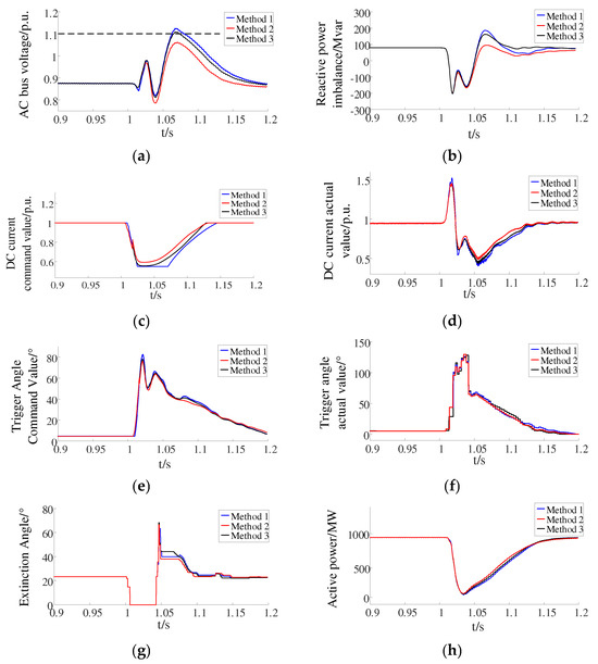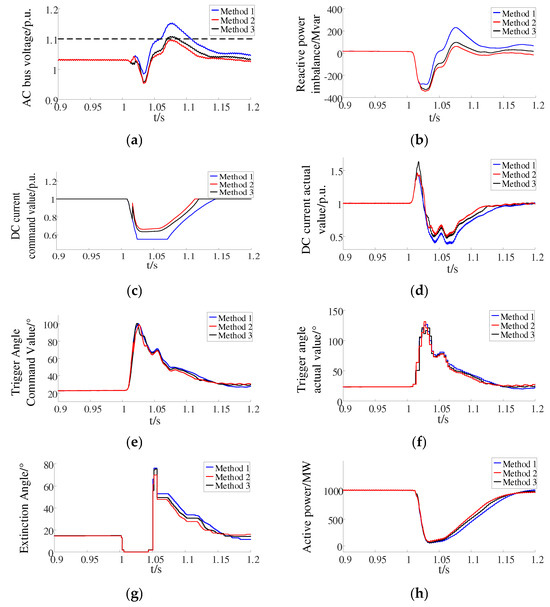 As shown in Figure 6b–d, the command value of the DC current was changed because the control was switched when the DC current was reduced under Method 2. The DC current under Method 2 was greater than that under Method 1 and Method 3 after 1.04 s. The decrease in DC current reduced the reactive power imbalance and thereby reduced the AC bus voltage. As shown in Figure 6e,f, the trigger angle command value under Method 2 was reduced compared to Method 1 and Method 3, and the actual value of the trigger angle was also relatively reduced. As shown in Figure 6h, the active power fed to the rectifier station under Method 2 was increased compared to Method 1 and Method 3. The reduced active power variation and reactive power imbalance caused the AC transient overvoltage to decrease. As shown in Figure 6g, there was no subsequent commutation failure under the three methods. The AC transient overvoltage was prevented by Method 2, without increasing the risk of commutation failure.