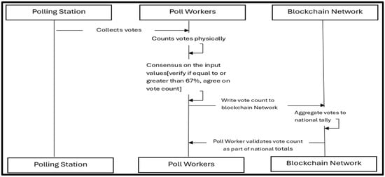 In the context of blockchain-based voting, the “generals” are analogous to the EPoS at each polling station, and the “city” is the correct vote count that must be agreed upon. The blockchain serves as a communication channel through which the generals send their plans (vote count) to each other. The smart contract on the blockchain is designed to record the vote count only when a consensus of 67% is reached, similar to how the generals must agree on a common plan of action.