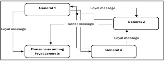 Figure 2 shows a graphical representation of the Byzantine General Problem, in which several generals, represented as nodes, use messages to coordinate a joint decision. The diagram shows the direct exchange of messages between some generals, which represents ideal, non-deceptive communication. However, the introduction of disloyal generals complicates this scenario. These untrustworthy figures send deceptive or contradictory messages, which are labeled “traitor messages” in the diagram. The main challenge is that the loyal generals must overcome these deceptive messages to reach a unanimous decision, which is depicted as a “consensus among the loyal generals”. This image effectively conveys the key challenge of balancing trust and deception to achieve unified decision-making.