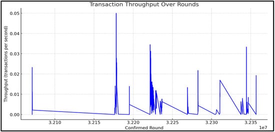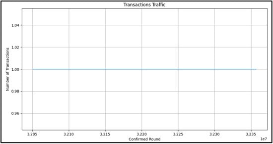 The plot in Figure 11 shows how the number of transactions varies over time (confirmed rounds). You can see patterns, spikes, or fluctuations in transaction activity. For example, if there are sudden peaks in the graph, it suggests moments of high transaction activity, while flat regions indicate periods with lower transaction volumes. The above graph shows flat regions, which indicate prolonged moments of low transactions.