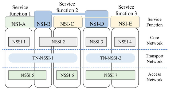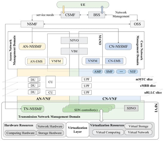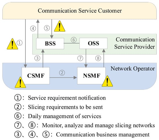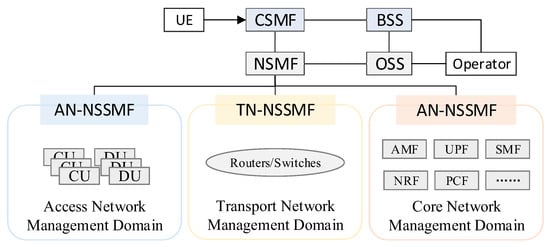 - CSMF (Communication Service Management Function): This manages communication services, each of which is completed by one or more network slices; CSMF interfaces with the BSS of the operator’s network and is responsible for slicing service operations; slicing users order slices from the operator through CSMF and submit relevant SLA requirements (e.g., number of online users, average user rate, latency requirements, etc.), and the CSMF converts the subscriber’s communication service requirements into network slice requirements for the NSMF and forwards them to the NSMF [19].