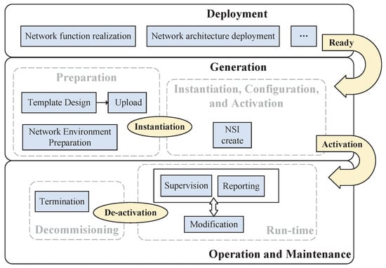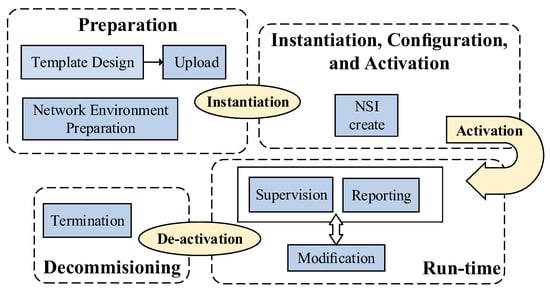 - Preparation: The main work in this phase includes: slice template design and upload, network environment preparation, etc. A slice template, which can be also called a network service template, is essentially a text file describing the user’s service requirements. The content of the slice template includes information on the type, number and specification of network elements required for the service, resources and connections, etc. The main work of the slice preparation phase is to complete the invocation of network resources and ensure the allocation of slicing resources at a later stage.