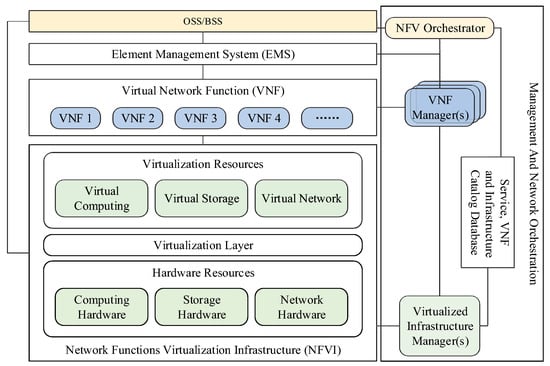 - NFVO (NFV Orchestrator) is mainly responsible for coordinating the management of VNFM and VIM. It makes the creation of the VNF more reasonable and safe, and the operation more reliable and effective [20]. In addition, the NFVO connects to other data repositories, such as the network service catalog, VNF catalog, instance catalog and NFV infrastructure resource database, which contain relevant information about their respective entities. Finally, a series of standard interfaces are set up in MANO to enable communication between different components in MANO and coordination between MANO and traditional network management systems (e.g., OSS, BSS and EMS: Element Management System).