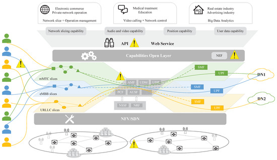 - Attacks on the public interface to gain access to the slice (or communication service) management module. During the slice generation phase, external operators can access the slicing management module through the northbound standardized API [43]. Operators can perform different operations in different scenarios, such as creating or deleting slices, configuration, activation and monitoring of different levels of slices, etc. An attacker can interfere with slice configuration and activation, and thus the creation, instantiation and decommissioning process of a slice (or communication service) [18], by attacking the API. Examples include modifying existing slice configurations or deleting activated slices to cause denial of service, modifying slice routing configurations to cause malicious route targeting and potentially denial of service (or malicious charging) of slices (or communication services).