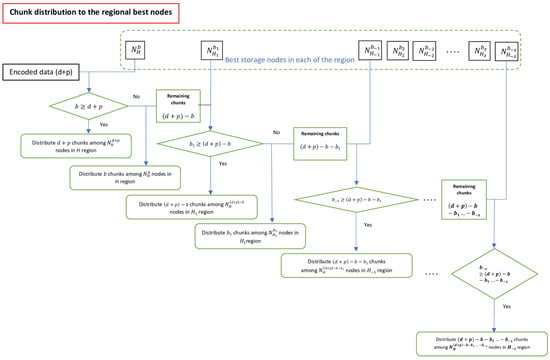 The data uploading process can be seen in Figure 3. To reduce the complexity of the flowchart, the process of chunk distribution to the regional best nodes is explained in a separate flowchart (Figure 4). In the uploading process, when a user submits a storage request, the system uses Reed–Solomon encoding (Algorithm 1, line 1) to split that data into multiple chunks (data and parity). A Reed–Solomon encoder takes a block of digital data and divides it into equal-sized data chunks. After this, by applying arithmetic operations, parity chunks are calculated. The parity chunks are extra redundant bits to deal with the chunk loss. An objective here is to tolerate the loss that could be caused by the distributed nature of the chosen platform and the resulting failure of some nodes. In that case, a fresh copy of the status and the available resources of each solution space (home and neighboring regions) is fetched via the API so that the information can be used by DSWS. Here, the distributed swarm workflow scheduler DSWS (Algorithm 2) is executed, which uses the required resources of each of the chunks and scans all solution spaces concurrently to identify the regional and global best service providers. Once regional and global best DSN service providers are found, one copy of the chunks will be distributed to the regional best by giving preference to the home region, and replicas will be distributed to the global best (Algorithm 3, line 11). Algorithm 3 (line 3) concurrently executes the chunk distribution task using a lightweight multithreading technique and responds to the user for task completion. Each of the storage requests is processed asynchronously to parallelize the process of storing data chunks on the storage nodes based on available logical cores of the CPU, improving the system performance.
