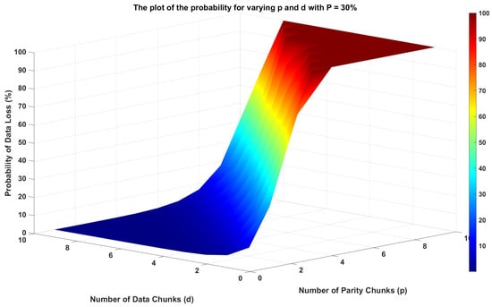 Figure 5 illustrates, by keeping node failure probability set to 30, how the probability of data loss changes by varying the number of data and parity chunks in a distributed storage system using Reed–Solomon encoding only. From the color slope, which denotes the likelihood of data loss, we can see that the probability of data loss reduces as the number of parity chunks grows. This was expected since additional parity chunks indicate more redundancy and, consequently, a greater tolerance for node failure. Conversely, for a constant number of parity chunks, the probability of data loss also rises as the number of data chunks grows. This is because more data chunks could potentially be lost. Overall, the figure shows the trade-off between fault tolerance and storage efficiency. By using more parity chunks, the system shows more robustness against data loss but at the cost of large storage overhead. Thus, the optimal balance between p and d may depend on the particular requirements of storage capacity and fault tolerance.