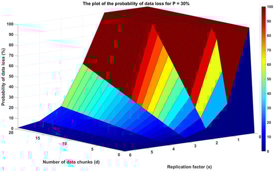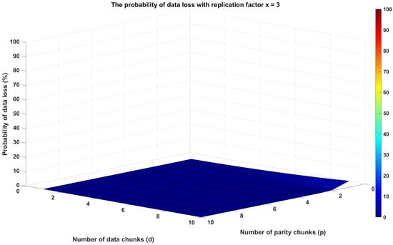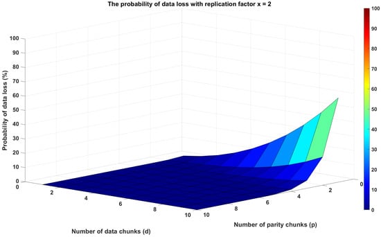 Figure 6 shows, by keeping the node failure probability set to 30, how the probability of data loss changes by varying the replication factor and the number of data chunks in a distributed storage system using replication only. As the replication factor rises, the probability of data loss reduces, which is aligned with our expectation because more replicas of each data chunk decrease the probability of data loss. On the other hand, the probability of data loss increases as the quantity of data chunks increases because more chunks might potentially fail. Moreover, it also emphasizes the deteriorating effect of the replication factor, as the probability of data loss rapidly increases exclusively for lower replication factors.