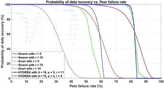 Conversely, the green and red plots represent Snarl and Swarm, respectively, indicating a quick deterioration in the data recovery likelihood as the peer failure rate grows. Our proposed system shows dual advantages against the Swarm network. For a peer failure rate of 50%, saving around half of the storage, the proposed system provides about 8% higher data recovery likelihood compared with the Swarm network for replication factor 10. Likewise, for a peer failure rate of 80%, the proposed system uses 5.122 times less storage and provides about 21.6% higher data recovery likelihood compared with the Swarm network with . Furthermore, Snarl also cannot match the effectiveness of HYDREN here. HYDREN and Snarl consume around the same storage. For a peer failure rate of 50%, the data recovery likelihood of the proposed system is about 100%, while Snarl provides 83.3%. Similarly, for a peer failure rate of 80%, the data recovery likelihood of the proposed system is about 95%, while Snarl gives 90.6%.