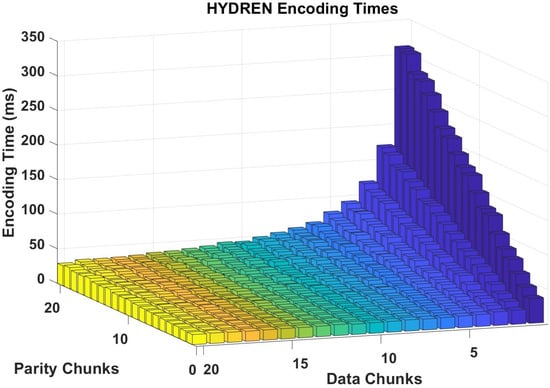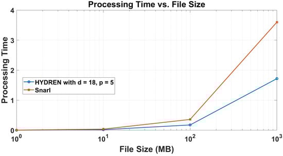 We also evaluated the effectiveness of HYDREN by assessing its encoding speed and comparing it against Snarl as a state-of-the-art solution. Figure 10 provides a 3D vision of HYDREN’s encoding speeds using a 10 MB file, modifying both the parity and data chunks. For the smaller number of parity chunks, the encoding time stays reasonable across a spectrum of data chunks, showing only an insignificant increase. However, there is a substantial increase in encoding time with a rise in parity chunks, which was expected because of the additional computation needed for generating the parity chunks. Table 2 shows a processing comparison between HYDREN and Snarl for different file sizes. Compared to Snarl, HYDREN consistently shows lower processing times for all file sizes, verifying its effectiveness. For a 1 MB file, HYDREN takes only 0.001854 s to encode, compared with Snarl’s 0.0038 s. This tendency continues as file size increases. HYDREN takes only 0.017804 s to encode a 10 MB file, while Snarl encodes it in 0.037 s. The difference in encoding time reaches its peak for the 1000 MB file, where HYDREN encodes it in 1.719 s, better than Snarl’s 3.600 s. Moreover, the benefit of HYDREN is considerable for larger data (Figure 11), where the encoding time for HYDREN does not grow larger proportionally with the size of the data, as opposed to Snarl.