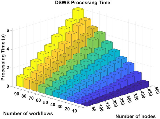 Figure 12 illustrates the performance of the DSWS distributed swarm workflow scheduler. The plot demonstrates the execution time of DSWS for varying numbers of service providers and workflows. It can be noted that the execution time increases linearly for both axes with the increase in the number of nodes and workflows, which was expected, since with the increase in workflows, more computational tasks are introduced and the search space for optimization algorithms grows larger.