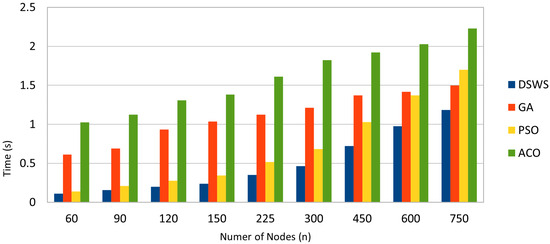 Figure 13 compares the performance of DSWS with a genetic algorithm (GA) solution [35], particle swarm optimization (PSO) [36], and ant colony optimization (ACO) [37] for 30 workflows. The results indicate that DSWS continually outperforms the traditional algorithms, sustaining lower processing times for different sets of nodes. This suggests that DSWS is efficient not only for distributing workflows but also for executing them more quickly than traditional methods.