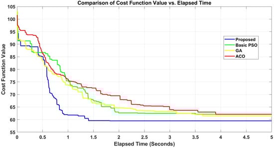 Figure 14 provides a convergence analogy, indicating how promptly each method proceeds toward an optimum solution. Compared with the PSO, GA, and ACO methods, the proposed DSWS algorithm converges faster and reaches the lowest cost function value in the least elapsed time, which is an illustration of a more effective optimization approach, arriving at an optimal or near-optimal solution in less time. Regardless of the size of the solution space, the proposed DSWS system not only improves processing times but also converges quickly to an optimal solution. This confirms DSWS as a significant improvement in distributed scheduling approaches.
