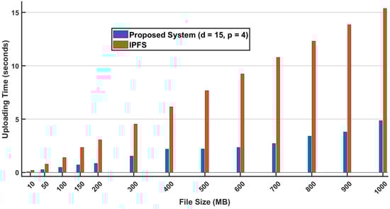 The results in Figure 15 show that both systems demonstrate that as the file size increases, there is also an increase in uploading time. However, the proposed system consistently maintains a lower uploading time compared to IPFS. This is because of the effectiveness of the chunk distribution approach enabled by a lightweight multithreading strategy that accelerates task completion and scales well even as the size of the file approaches 1000 MB. Conversely, the IPFS network executes this process with a single stream.