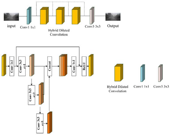 To address the issue of large-scale feature information being ignored and the resulting inaccurate K(x) values in the AOD-Net network module, this paper introduces the hybrid dilated convolution (HDC) module [22]. The AOD-Net network structure is thereby enhanced, as depicted in Figure 3, to ensure more accurate and effective defogging.