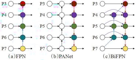 The bidirectional feature pyramid network (BiFPN) incorporates a bidirectional cross-scale connection mechanism. It introduces weight values to assign different weight coefficients to different features, enabling effective utilization of information from each feature layer and enhancing feature fusion across different layers. This partitioning of feature layers facilitates improved connectivity and fusion between layers. The fusion mechanism is depicted in Figure 6 for visual comparison.