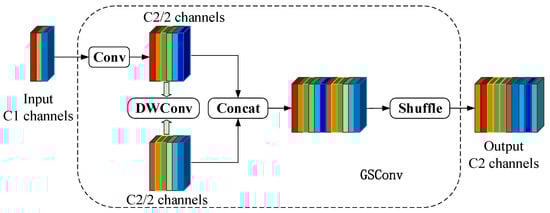 GSConv is a compact network module that aims to balance model accuracy and network simplicity [24]. The network structure, depicted in Figure 7, maintains model accuracy while simplifying the network architecture. This structure leverages a combination of depth-separable convolution and standard convolution to effectively utilize both types of convolutional features. By doing so, the model weight is reduced without compromising accuracy. This approach addresses the issue of channel information loss observed in the CSP convolution module.