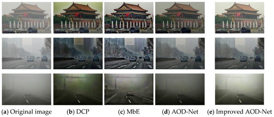 Figure 10b depicts the defogging graph of the DCP algorithm. It can be observed that the algorithm performed well in defogged light fog environments, but the sky background information was significantly distorted, and images in medium and dense fog environments suffered from brightness loss, loss of information detail, and low contrast. The defogging graph of the MbE algorithm is shown in Figure 10c. The algorithm demonstrated a satisfactory defogging impact in light fog conditions, boosting the contrast and visual appearance of the image information. However, in medium and heavy fog environments, the algorithm exhibited certain limitations; the background was badly blurred and distant information seriously lost. Figure 10d depicts the AOD-Net algorithm’s fog-removal map. The algorithm effectively enhanced the color information in the image after fog removal, resulting in richer color representation. However, it was observed that the image appeared darker after the fog removal process, which may pose challenges for subsequent tasks such as target detection. Figure 10e depicts the improved AOD-Net algorithm’s fog-removal map, which successfully improved the image color information while maintaining the target detection ability. The enhanced AOD-Net defogging map, which successfully eliminated the fog from the picture while preserving the color information of the original image, is shown in Figure 10e. It also enhanced the color brightness of the defogged image. The comparison experiments demonstrated that the enhanced AOD-Net neural network defogging algorithm beat the competing defogging algorithms in terms of enhancing image contrast, color recovery, and brightness.