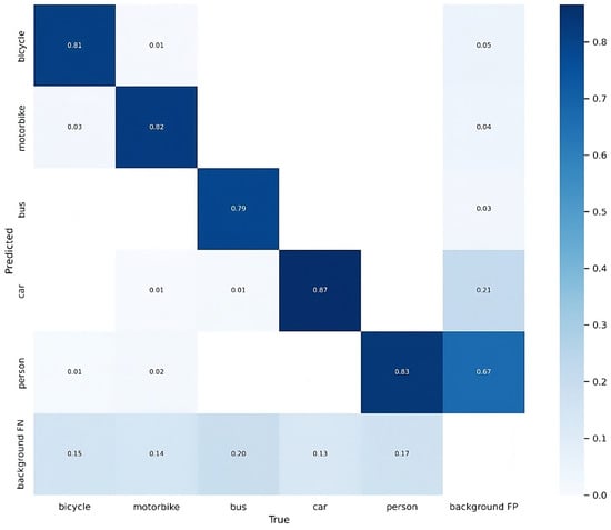 Using the training platform described above and setting the training parameters of the model, the improved YOLOv5s target detection network model was trained. The improved YOLOv5s confusion matrix is shown in Figure 11, and the PR curve of the improved YOLOv5s is shown in Figure 12.