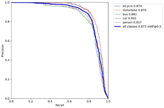 The enhanced mAP@0.5 reached 87.3%, as shown by the training model data, and had decent recognition accuracy for larger targets including vehicles, bicycles, and pedestrians.