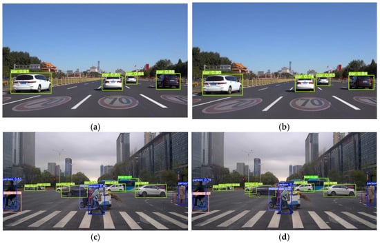 Comparison of target detection effects: (a) YOLOv5s vehicle detection effect on straight road; (b) improved YOLOv5s vehicle detection effect on straight road; (c) YOLOv5s vehicle detection effect at intersection; (d) improved YOLOv5s vehicle detection at intersection.
