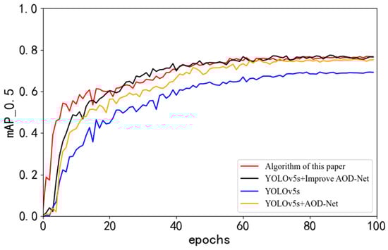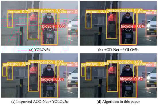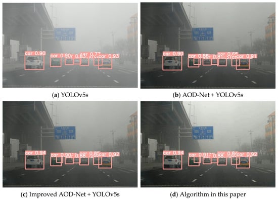 We can observe that the algorithm proposed in this paper exhibited improved target detection accuracy in foggy environments. According to the comparitive analysis of the target detection models in foggy environments presented in Figure 15 and Figure 16 and Table 6, our algorithm achieved an accuracy of 76.8%, which was 7.4% higher than that of YOLOv5s. According to a comparison of detection model accuracy, AOD-Net + YOLOv5s can increase the accuracy of target detection in a foggy environment, suggesting that the AOD-Net defogging algorithm has some bearing on target recognition. The improved AOD-Net increased the visibility of the target and improved the image defogging effect. The combination of the improved AOD-Net and YOLOv5s enhanced the precision of target recognition. The accuracy of target detection in foggy environments using the improved AOD-Net algorithm combined with YOLOv5s and the improved YOLOv5s was 77.4% and 76.8%, respectively, with a difference of 0.6% in detection accuracy. The enhanced YOLOv5s target detection model exhibits a reduced parameter count and a lighter model structure, making it better suited for vehicle target detection tasks.