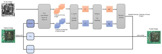 The fusion of images takes place on three levels: at the pixel level, at the feature level, and at the decision level. In pixel-level image fusion techniques, input images can be processed directly for further computer processing. The feature level techniques for image fusion involve the extraction of relevant features, such as pixels, textures, or edges, and blending them together to generate supplementary merged features. In decision level fusion, multiple classifiers combine their decisions into a single one that describes the activity that occurred []. A variety of fusion methods can be categorized into two groups: traditional algorithms (spatial and frequency domain techniques) and deep learning-based methods []. In spite of the high performance of traditional fusion methods, they have some disadvantages. A major problem is that fusion performance heavily depends on the extraction and selection of features, and there is no universal method for obtaining features. To address these drawbacks, deep learning-based fusion methods have been developed. In these fusion methods, deep learning is employed to extract deep representations of the information provided by the source images. Various fusion strategies have been proposed in order to reconstruct the fused image. The fusion strategy can also be designed with deep learning. In this paper, we employ the innovative fusion method proposed by Jingwen Zhou et al. [] that is presented for infrared and visible image fusion based on the VGG-19 model. In this method, unlike Li et al.’s proposed approach in [], the source image does not need to be split into basic and detailed parts. This decomposition makes the fusion process too complex and leads to the incomplete extraction of details and salient targets. The Jingwen fusion method uses grayscale images as inputs. Therefore, because the optical images are in color in this research, the IHS (intensity, hue, and saturation) transform is applied for transforming the optical images from RGB (red, green, and blue) to the IHS color space []. In the IHS space, intensity indicates the spectral brightness, hue represents the wavelength, and saturation reflects the spectrum’s purity. Through the Jingwen fusion method, the intensity component of the optical image is combined with the X-ray image and then the updated intensity, along with the hue and saturation, is converted back into RGB color space. The result of this process is a fused color image. Figure 1 displays the architecture of the whole fusion process. Instead of decomposing images into high and low frequencies, optical images and X-ray images feed into VGG-19 for layer-by-layer feature extraction. In X-ray images, hidden targets are usually visible because of the imaging characteristics of the technique. Optical cameras usually capture more surface details, but the targets are often covered by other objects and there is also no way to see inside the components. With its superior classification and location capability, VGG-19 is well suited to the fusion task because it can extract detailed features and salient targets.