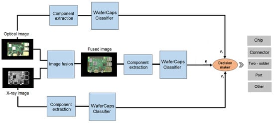 In this study, three WaferCaps-based networks are combined to accomplish a parallel decision fusion process. According to Figure 4, these parallel processes use optical, X-ray, and fused images to provide a final decision. Algorithm 1 shows a general view of this process. As will be seen from the results, some networks are able to accurately predict the class of components with a higher probability than others. Therefore, integrating these three networks improves the accuracy of detecting the class of components. Accordingly, the decision fusion approach will lead to an increase in the accuracy of the final classification of all classes. The combined and fused classifier is composed of a selection rule and three individual classifiers.
