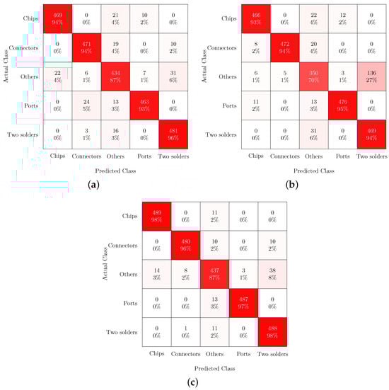 Confusion matrices for optical, X-ray, and fused image classifications using WaferCaps model. (a) Optical images; (b) X-ray images; (c) Fused images.