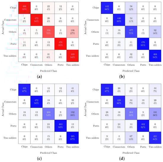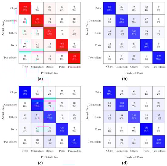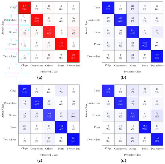 Confusion matrices for the X-ray dataset using different DL networks. (a) WaferCaps; (b) ResNet-50; (c) Inception-v3; (d) MLP.