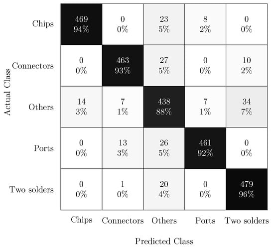 In this research, we build an image acquisition system that takes pictures from devices using X-ray imaging and an optical camera. For component detection and recognition that require high resolution and quality, the acquired images are suitable. In order to provide constant illumination, the optical system is enclosed in a tent that controls outside light. As a background, various colored papers are employed to help devices stand out from the background. For instance, red colored papers are used when the PCB base is black. In this research, we have 100 various circuit boards that range in size from 70 mm × 50 mm to 350 mm × 250 mm. The acquisition system includes a professional camera ‘Allied Vision ALVIUM 1800U-2050C-CH-C’ with two high-resolution lenses with two focal lengths of 35 mm and also 12 mm (KOWA LM35SC and KOWA LM12SC), which are mounted above distances of 42.6 cm and 62 cm for lenses 35 mm and 34 cm and 45 cm for lenses 12 mm. These four postures of lenses and camera positions guarantee that small and large PCBs (such as mainboards) are fully visible in a single image with high spatial resolution. All optical images have a resolution of pixels. During optical image acquisition, the PCBs are sampled in two different exposures, one high and one low, which are controlled internally by the camera software. With these two different exposures, we can both increase our dataset size and have a more accurate interpretation of different components with different materials. An X-ray machine is one of the best ways to inspect the quality of electronic boards. The SCANNA mailroom X-ray machine (SCANMAX 225) with an additive high-resolution panel (80 Micron) offers a spacious scan area of 56 cm × 42 cm, which is large enough to accommodate most PCBs and includes its own control and analysis software. The X-ray images are made up of pixels. We assume in this paper that the images to be fused have been registered correctly and that sufficient single-component images have been extracted from the PCB images. We process data in RGB format according to five classes: chips, connectors, two solders, ports, and others. Training, validation, and test data are separated into three categories. There are 4000 components images per class in total. The training dataset has 15,000 samples, whereas the validation and test datasets each contain 2500 samples.