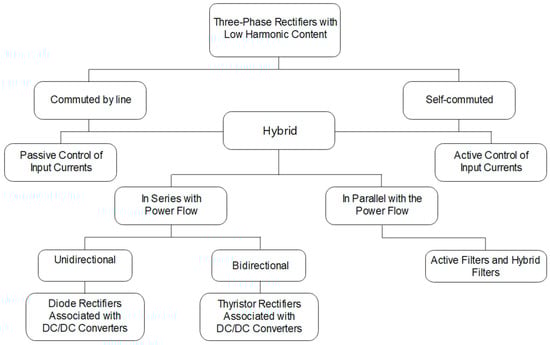 There are several types of three-phase rectifiers with low harmonic content for use in different types of loads, and they can be classified into two large groups, line-commutated and self-commutated (electronically regulated), as shown in Figure 1 [1,2]. In the case of three-phase line-switched rectifiers, diodes are used as a switching device, being driven by the frequency of the input AC voltage. Self-commutated rectifiers use adjustable switching devices (Thyristor, IGBT, MOSFET) activated through a control system [3]. These rectifiers have good performance such as low THD and high PF, and can meet international standards. They have a problem of complexity (due to the control system) and economic viability when applied to high powers [3]. Some power factor correction techniques have been developed to reduce the harmonic content of some three-phase rectifiers. Figure 1 shows the classification of three-phase rectifiers with reduced harmonic content [1,2]. These three-phase rectifiers can present improvements in THD and PF, and some rectifiers can meet the recommendations of established international standards, as is the case with hybrid three-phase rectifiers (HTR), which is the study objective of this work.
