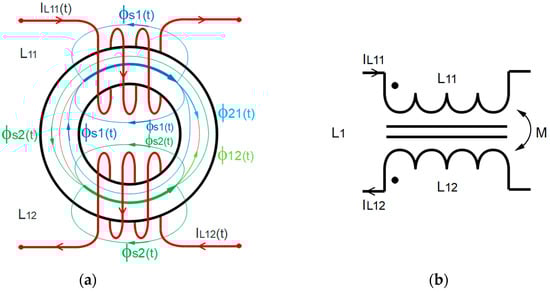 Figure 4 illustrates an equivalent scheme of the coupled inductor in a discordant direction, consisting of two inductors () coupled by a toroidal core. The current that runs through the primary inductor is the same current (in the opposite direction) that runs through the secondary inductor . The flows generated by the inductors and consecutively the mutual flows are also presented. The windings of the inductor wires are discordant in direction and, therefore, much of the mutual flux cancels each other out because they run in opposite directions. The directions of the magnetic fluxes were determined using the right-hand rule. The methodology applied to study the coupled inductors () is based on [12,13,14,15,16].