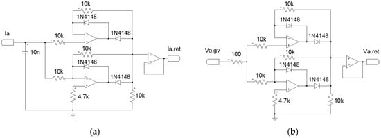 - Current precision rectifier: The output signal of the current sensor (AC) is thus rectified by a current precision rectifier (CPR) in negative polarity. The CPR consists mainly of three operational amplifiers, the first two of which are designed for proper rectification and the last is a Buffer circuit [2,17]. Figure 5a shows the CPR of just one phase.