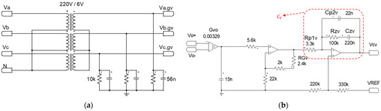 - AC voltage sensor: The input voltage sensors used are transformers in each phase, with a ratio of 220 V/6 V (sensor gain = 0.0273) in star-star configuration, as shown in Figure 6a. In this way, the voltages , , , are obtained, which are images of the input voltages. Three resistors connected in a star are also applied as a load to the output of the transformers, with the central point connected to the ground of the control circuit, serving as a virtual neutral. To avoid high frequency noise above hundreds of Hz, 56 nF capacitors were added in parallel with the resistors.