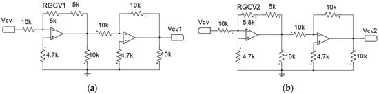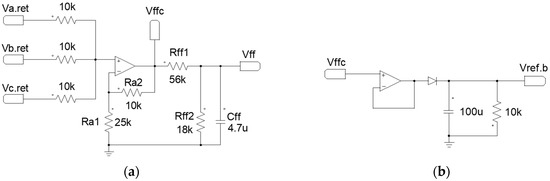 Figure 7. Current level regulator circuit: (a) Rectifier 1; (b) Rectifier 2. - Feed-forward voltage circuit: The circuit applied to the feed-forward voltage loop is shown in Figure 8a. It can be seen that the circuit consists of a three-resistance voltage adder (to generate the voltage ), an operational amplifier (to generate the voltage ) and a voltage divider with a filter (to generate the voltage ).