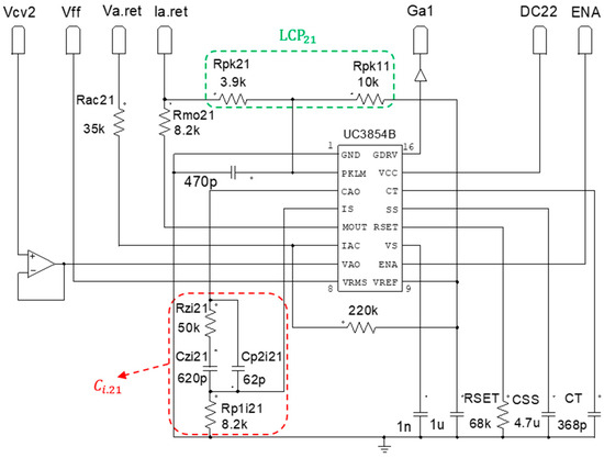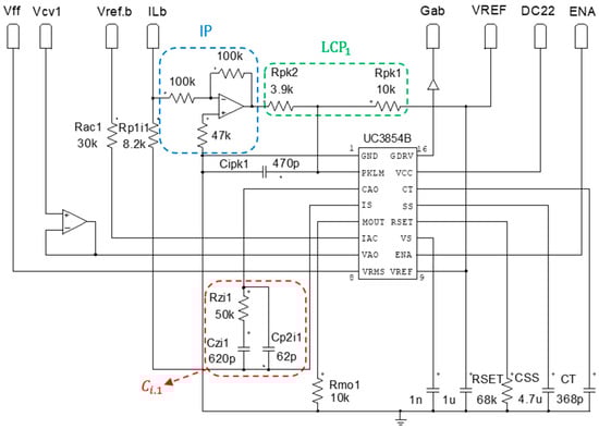 In the proposed HTR, the Rectifier 1 control circuit consists of the UC3854B, current compensator , the peak current limiter ( and ), the power limiter (), the resistance and other components, as shown in Figure 9. As for Rectifier 2 (taking module 1 as an example), the control circuit consists of the UC3854B, a current compensator , the current limiter peak ( and ), the power limiter (), the resistance and other components, as represented in Figure 10.