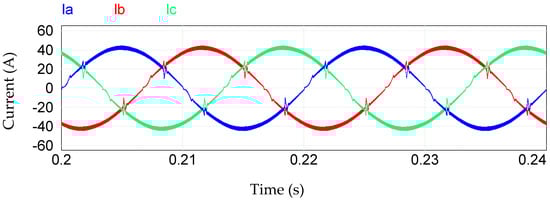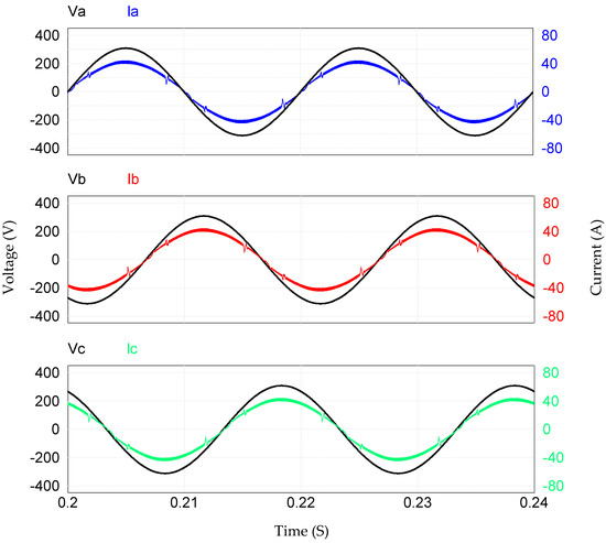 The PFC with the proposed control system was achieved and this can be observed with the sinusoidal waveform of the current and the phase shift with the respective voltage, in each phase [3,12]. In Figure 12, the voltage and current for each phase of the rectifier are shown (the scale of the current waveform in relation to voltage was separated and increased to allow better visualization). It is noted that in each phase, the current waveform presents the same voltage waveform (it is in phase with the voltage), which allowed obtaining a PF of 99.92% and a THD the current of 3.96% also, indicated in Table 2. These values allow us to conclude that the proposed rectifier operates below the limit values recommended by international standards (THD = 5%), namely IEEE 519 and IEC61000-3-2 [26,27], which ensures the quality of the power grid using the proposed rectifier.