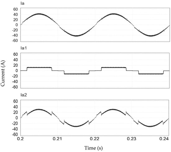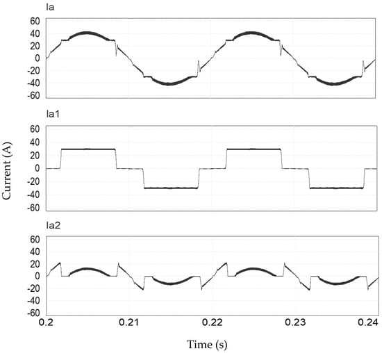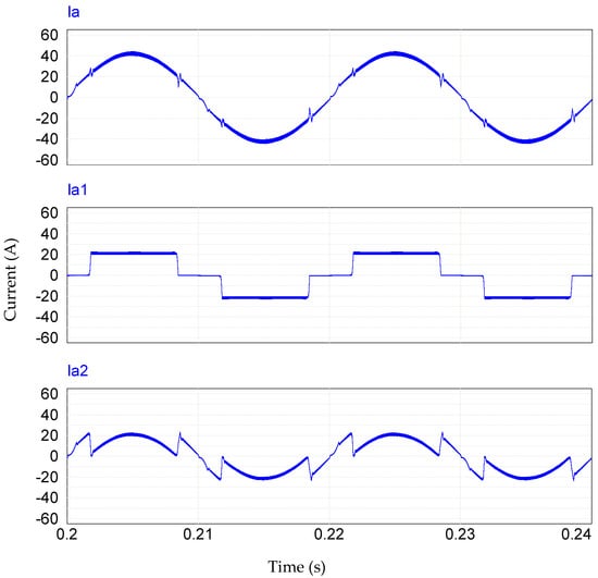 Since the HTR is composed of two rectifiers (Rectifier 1 and Rectifier 2), it is noted that the peak current obtained at the input of the HTR has a value of the order of 43 A per phase. This value is made up of the Rectifier 1 peak current of 21.5 A and the Rectifier 2 peak current of 21.5 A. This allows us to conclude that the peak current distribution between the rectifiers is 50% [3,4,12], presented in Figure 13. The current waveforms in phase A, of the hybrid rectifier, seen in Figure 13, show the expected waveforms, that is, Rectifier 1 generated a rectangular waveform (Ia1) and Rectifier 2 generated a waveform (Ia2) such that, when adding the two waveforms, a sinusoidal wave form was obtained in the HTR phase (Ia).