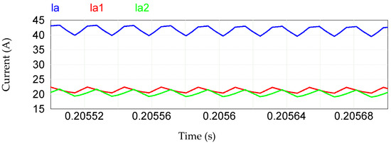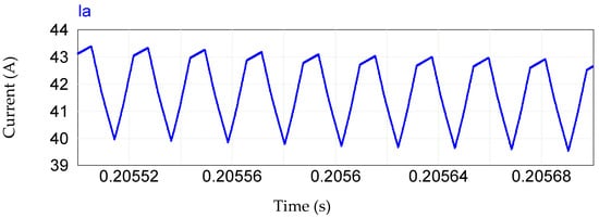 Through the 50 kHz switching frequency of the Boost converter in each rectifier module, the input current waveform in the proposed rectifier presents a current ripple. This current ripple is shown in Figure 14 (referring to phase A), representing a ripple of approximately 3 A. A deformation in the shape of the current ripple is noted, which is due to the fact that it is a wave obtained by the sum of two current waves (Rectifier 1 and Rectifier 2), which are not synchronized, thus presenting a small phase difference between them, which is shown in Figure 15. It is important to highlight that this does not affect the operation of the HTR.