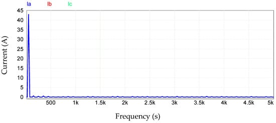 To observe the frequencies that make up the waveforms as the three currents obtained (), the Fast Fourier Transform (FFT) was applied, shown in Figure 16. It is observed that the currents are basically composed only of the fundamental frequency 50 Hz. This analysis presents the fundamental frequency and some harmonics with very low values that can be disregarded.