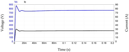 Observing the behavior of the output voltage and current of the proposed three-phase hybrid rectifier, in Figure 17, the dynamic range for both quantities is similar. It is observed that at the beginning of the transient period, the output voltage rises to a value of 875 V, and adjusts until it reaches a stable value of 760 V in 0.1 s. The output current also has a similar behavior, reaching a peak value of 30 A and then (after 0.1 s) stabilizing to a value of 26.3 A.