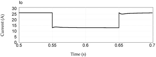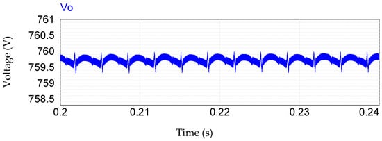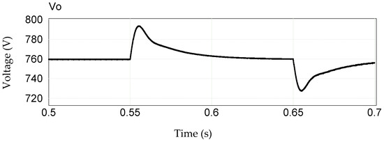 For the output of the hybrid three-phase rectifier, the current is shown in Figure 20 and the voltage in Figure 21. Initially, there is a nominal current of 26.31 A, and voltage of 760 V. At the instant (0.55 s) in which the load goes from 100% to 50%, the current drops in value and stabilizes in 0.6 s to a value of 13.15 A, at this same instant of 0.5 s there is a sudden increase in the output voltage, reaching a maximum value of 790 V in 0.565 s, which stabilizes to 760 V in 0.625 s. The charge then goes to 100% in 0.65 s, in this case the current shows a small ripple and stabilizes at 26.31 A in 0.68 s, while the voltage drops sharply, reaching a value of 728 V (thus, it showed the same voltage behavior during the 50% load reduction period). Note that the output voltage takes longer time to stabilize, which is due to the high value of the output capacitor .